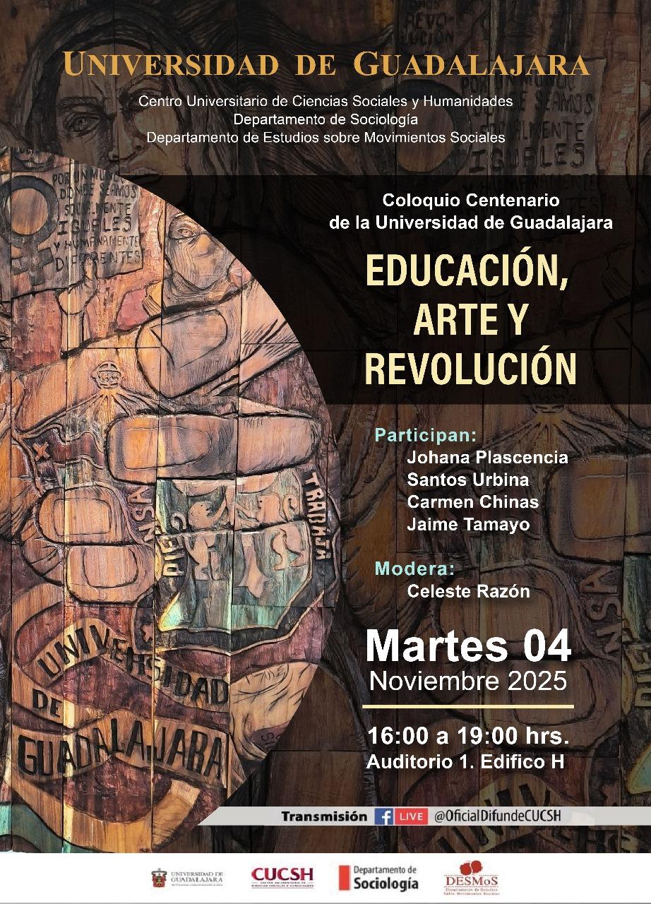 El Centro Universitario de Ciencias Sociales y Humanidades, El Departamento de Sociología y el Departamento de Estudios Sobre Movimientos Sociales de la Universidad de Guadalajara tienen el agrado de invitarle al Coloquio Centenario de la Universidad de Guadalajara: EDUCACIÓN, ARTE Y REVOLUCIÓN, donde participarán: Johana Plascencia Barrera, Santos Urbina, Carmen Chinas Salazar y Jaime Tamayo. Modera: Celeste Razón Gutiérrez. Martes o4 de noviembre de 2025, 16:00 a 19:00 horas. Auditorio 1 del Edificio H (CUCSH)