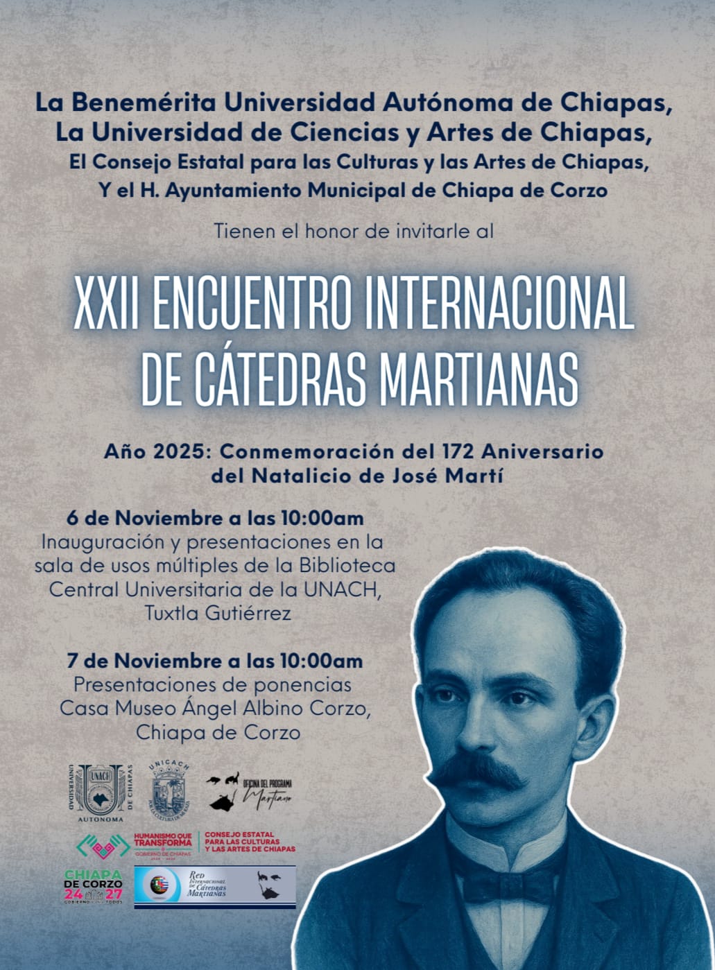 La Benemérita Universidad Autónoma de Chiapas, La Universidad de Ciencias y Artes de Chiapas, El Consejo Estatal para las Culturas y las Artes de Chiapas, Y el H. Ayuntamientos Municipal de Chiapas de Corzo, tienen el honor de invitarle al XXII Encuentro Internacional de Cátedras martianas, que se llevará a cabo el 6 y 7 de noviembre del 2025, con el siguiente programa: